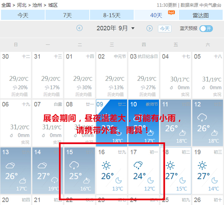 展會(huì)期間,晝夜溫差大,可能有小雨,請(qǐng)留意滄州天氣,攜帶外套、雨具!如您的愛(ài)車(chē)需進(jìn)入滄州會(huì)展中心,請(qǐng)辦理車(chē)輛通行證!祝大家商旅愉快!