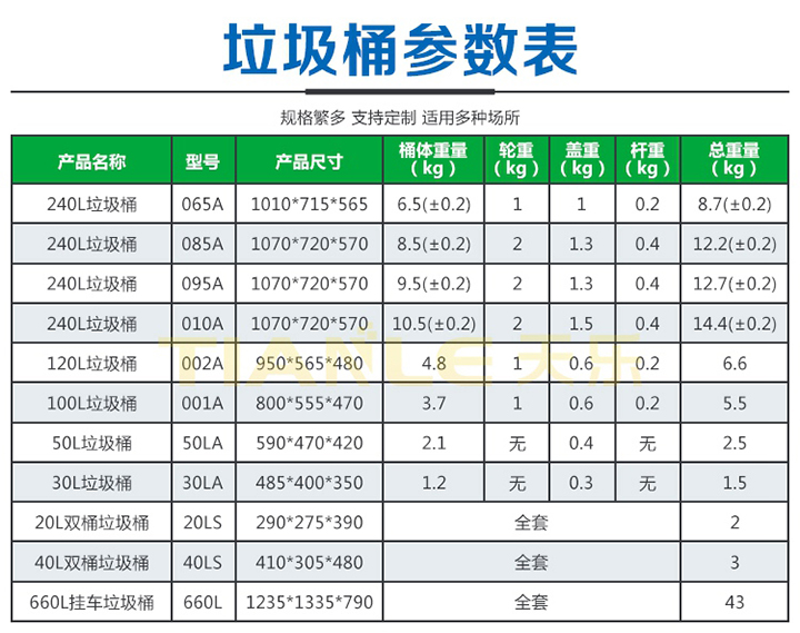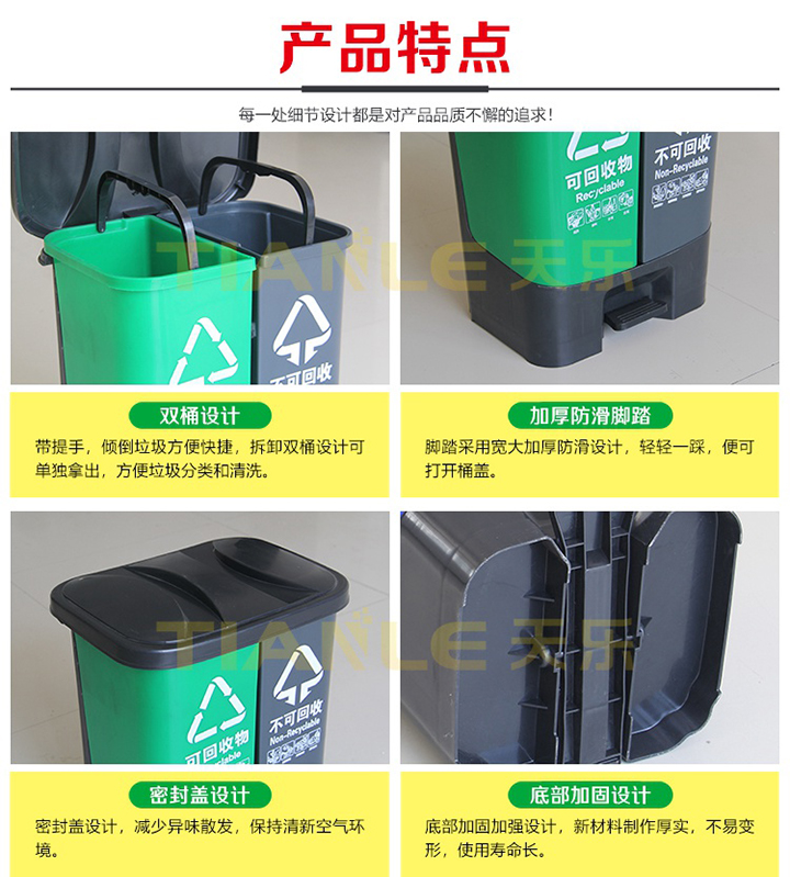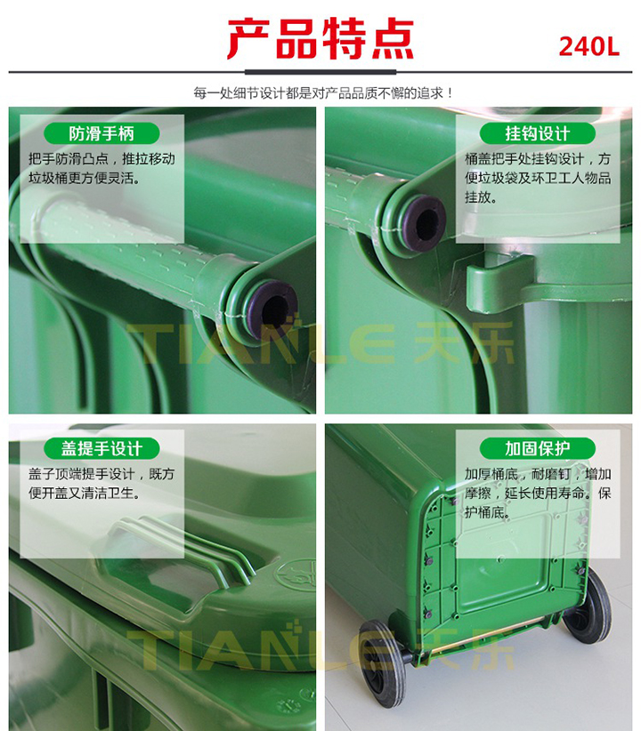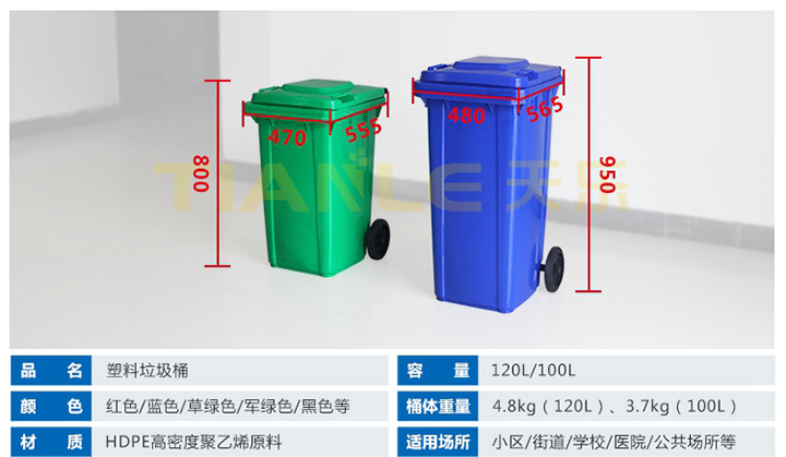 山東天樂(lè)塑料科技有限公司坐落于山東省菏澤市巨野縣城東工業(yè)園,緊鄰327國(guó)道,地理位置優(yōu)越,交通便利。天樂(lè)塑料是一家集研發(fā),設(shè)計(jì),制造,銷(xiāo)售為一體的大型生產(chǎn)塑料產(chǎn)品企業(yè),公司擁有大型注塑、吹塑成型設(shè)備十多臺(tái),擁有經(jīng)驗(yàn)豐富的設(shè)計(jì)研發(fā)團(tuán)隊(duì),可提供產(chǎn)品定制服務(wù)。專(zhuān)業(yè)生產(chǎn)240L分類(lèi)垃圾桶、120L/100L/50L/30L塑料垃圾桶、40L/20L雙胞胎垃圾桶、660L掛車(chē)?yán)?、智能垃圾桶、塑料托盤(pán)、塑料周轉(zhuǎn)箱(筐)、塑料折疊箱、PP中空板、拉伸纏繞膜等系列產(chǎn)品。垃圾桶廣泛適用于市政環(huán)衛(wèi)、鄉(xiāng)鎮(zhèn)環(huán)衛(wèi)、城市街道、小區(qū)、物業(yè)、學(xué)校、醫(yī)院、公園、各類(lèi)公共廣場(chǎng)、餐飲飯店、夜市大排檔、工廠、企業(yè)單位、花園、車(chē)站、碼頭、風(fēng)景名勝區(qū)等場(chǎng)所及分類(lèi)垃圾收集。塑料托盤(pán)廣泛應(yīng)用于倉(cāng)儲(chǔ)物流、電商快遞、食品醫(yī)藥、糧油面粉、煙酒飲料、商場(chǎng)超市、印刷印務(wù)、電子電器、化工化肥、服裝紡織、汽車(chē)汽配等行業(yè)。