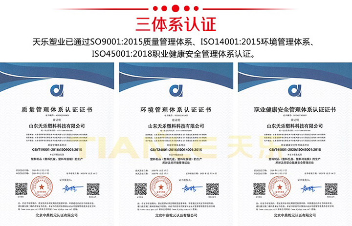 圣誕節(jié)前夕,天樂塑業(yè)公司迎來了“雙喜臨門”,我公司順利通過ISO質(zhì)量管理、環(huán)境管理、職業(yè)健康安全管理三體系認(rèn)證,AAA企業(yè)信用等級認(rèn)證。2020年天樂塑業(yè)公司獲得了突飛猛進(jìn)的發(fā)展,感謝客戶的每一次認(rèn)可,
